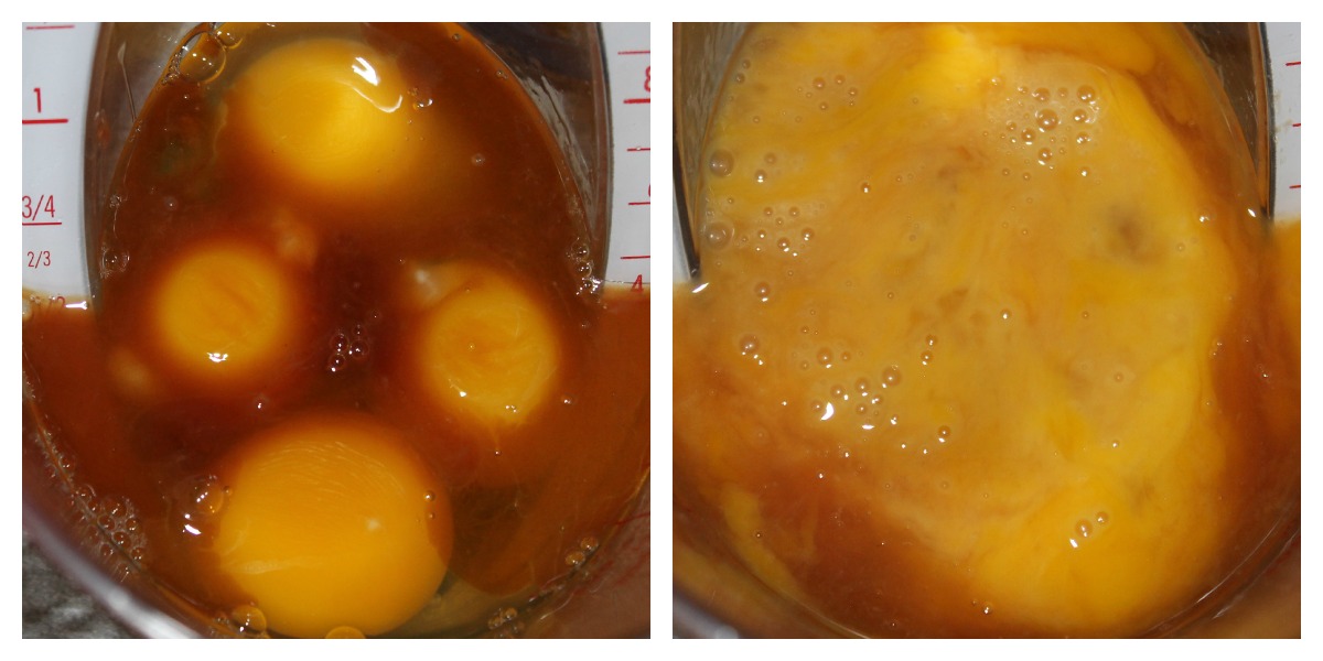 Add the eggs and egg yolks to a measuring cup with the vanilla extract. Lightly beat with a fork.