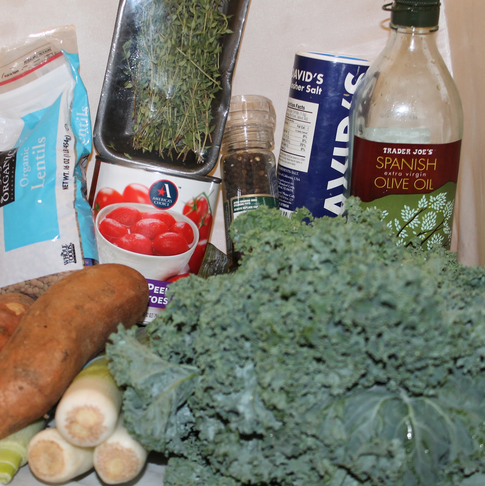 Stir in the kale, sweet potatoes, lentils, thyme, salt, and pepper. Cover, lower the heat, and simmer for 30 minutes or until the lentils are tender.