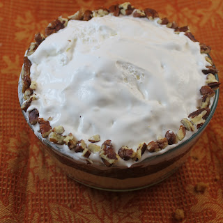Add a layer of chocolate pudding next. I attempted to put the pumpkin mousse first, which was silly. The pudding is much heavier than the pumpkin mousse and sank into it. So go pudding, pressing it against the sides of the bowl, and then put the pumpkin mousse on top.