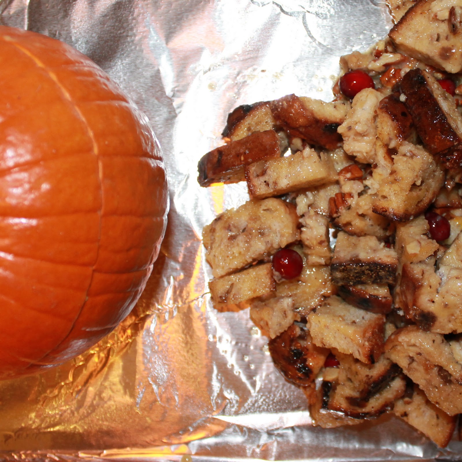 Bake the pumpkin and bread pudding for 25 minutes. Allow to cool enough to handle and add the bread pudding to the pumpkin.