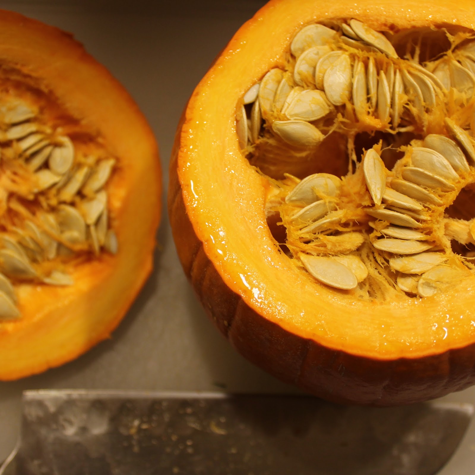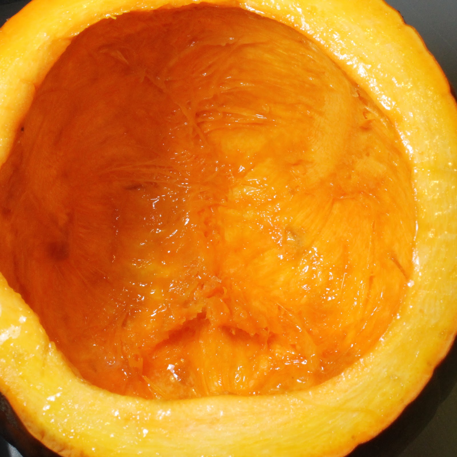 The pumpkin roasts and softens in the oven, making it easy to scrape away at it bite by bite.