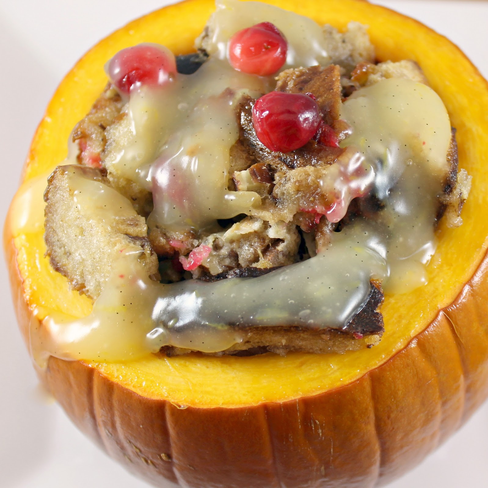When I came across the title of this recipe, I was intrigued. I wasn’t sure if this would actually be a success, but it sounded so interesting I had to give it a try. So behold, Stuffed Pumpkin Cranberry Raisin Bread Pudding.