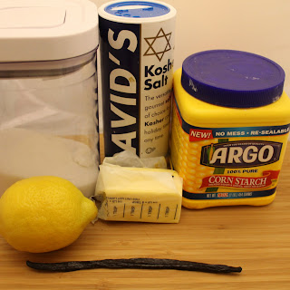 Add vanilla bean, water, corn starch, sugar, and salt to a saute pan over medium heat. Stir until smooth and thickened. Add the butter, lemon zest, and lemon juice. Stir to combine. Remove from heat when the mixture is warm.