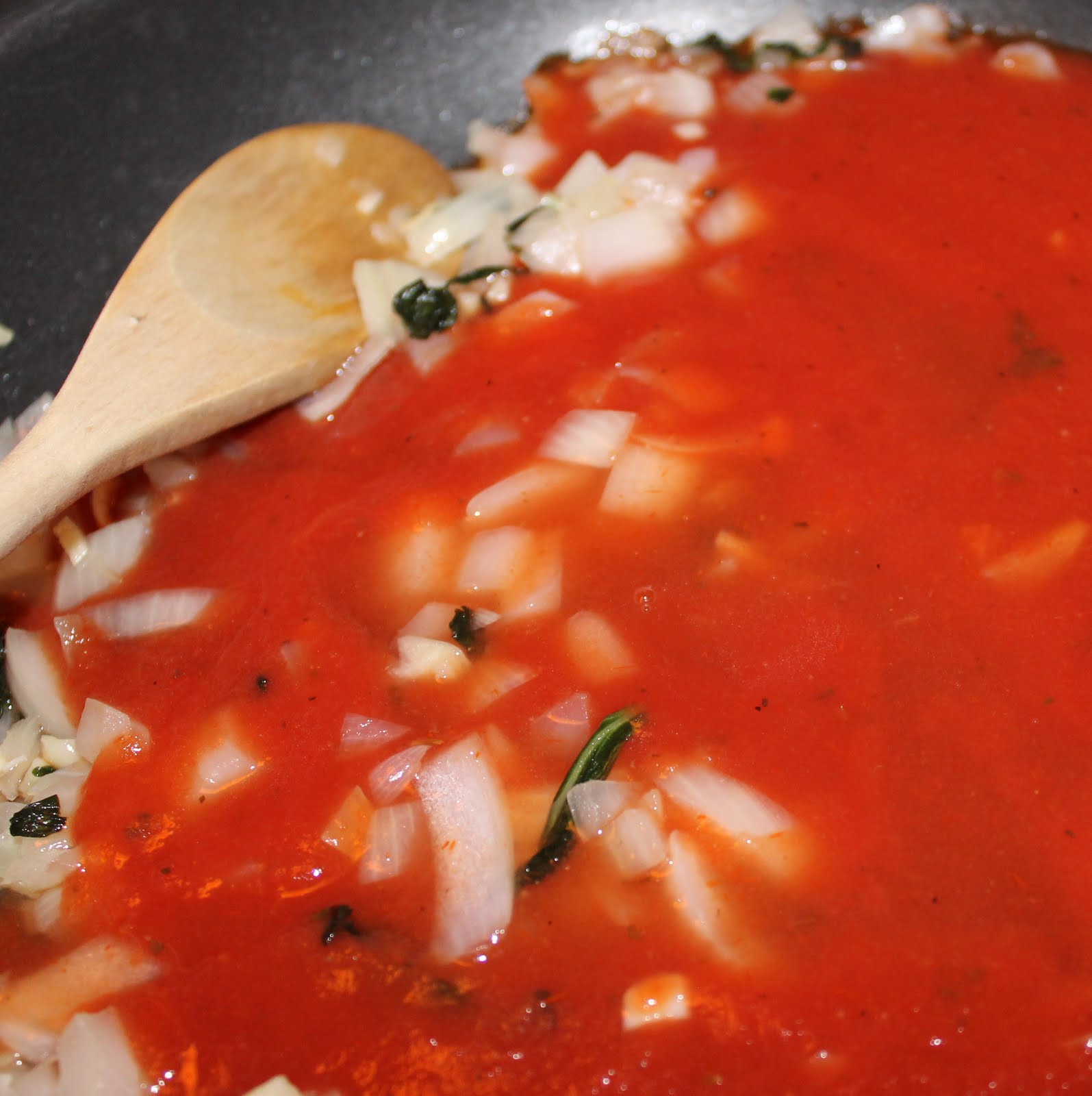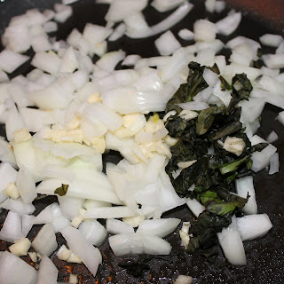 Heat a saute pan over medium-high heat and add the onion, garlic and basil.