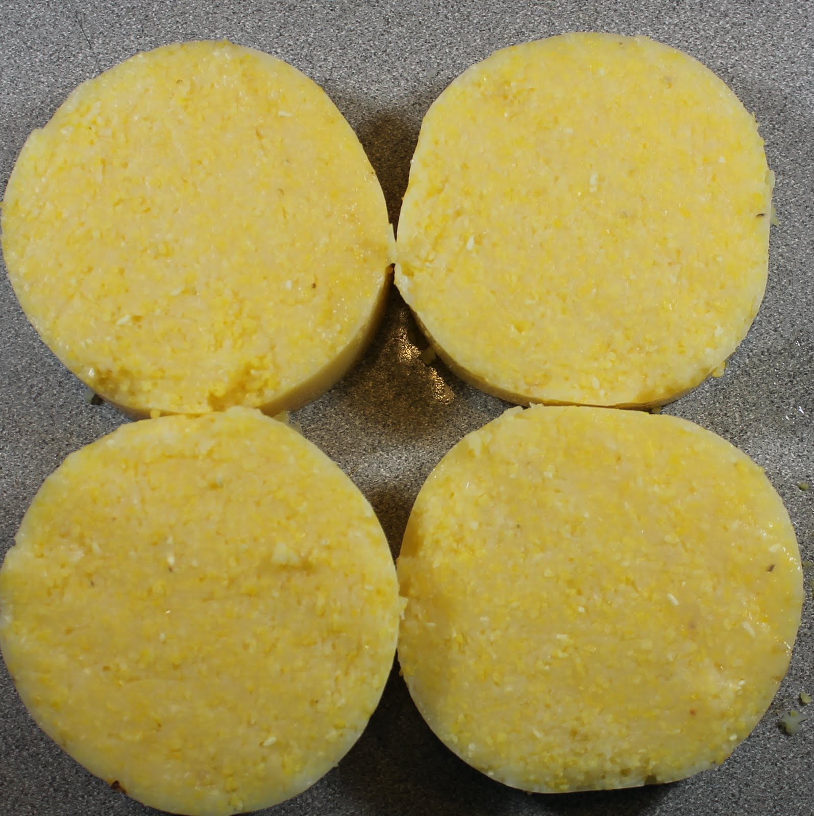 Using only half of the tube of polenta, cut the polenta crosswise into 4 equal slices.