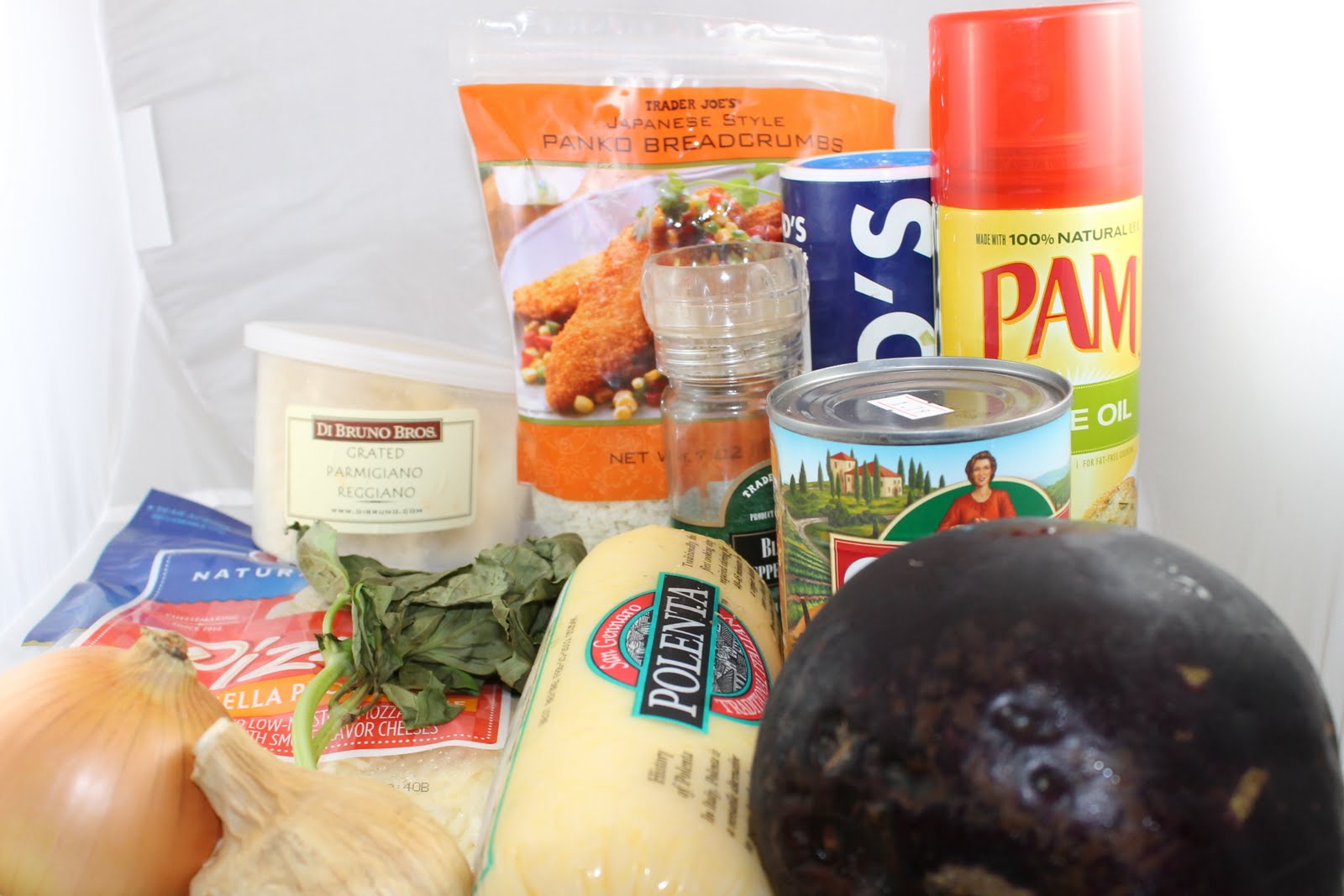 Lightly spray a cookie sheet with the cooking spray and add the polenta and eggplant to the sheet. Spray another layer of the cooking spray on the slices.