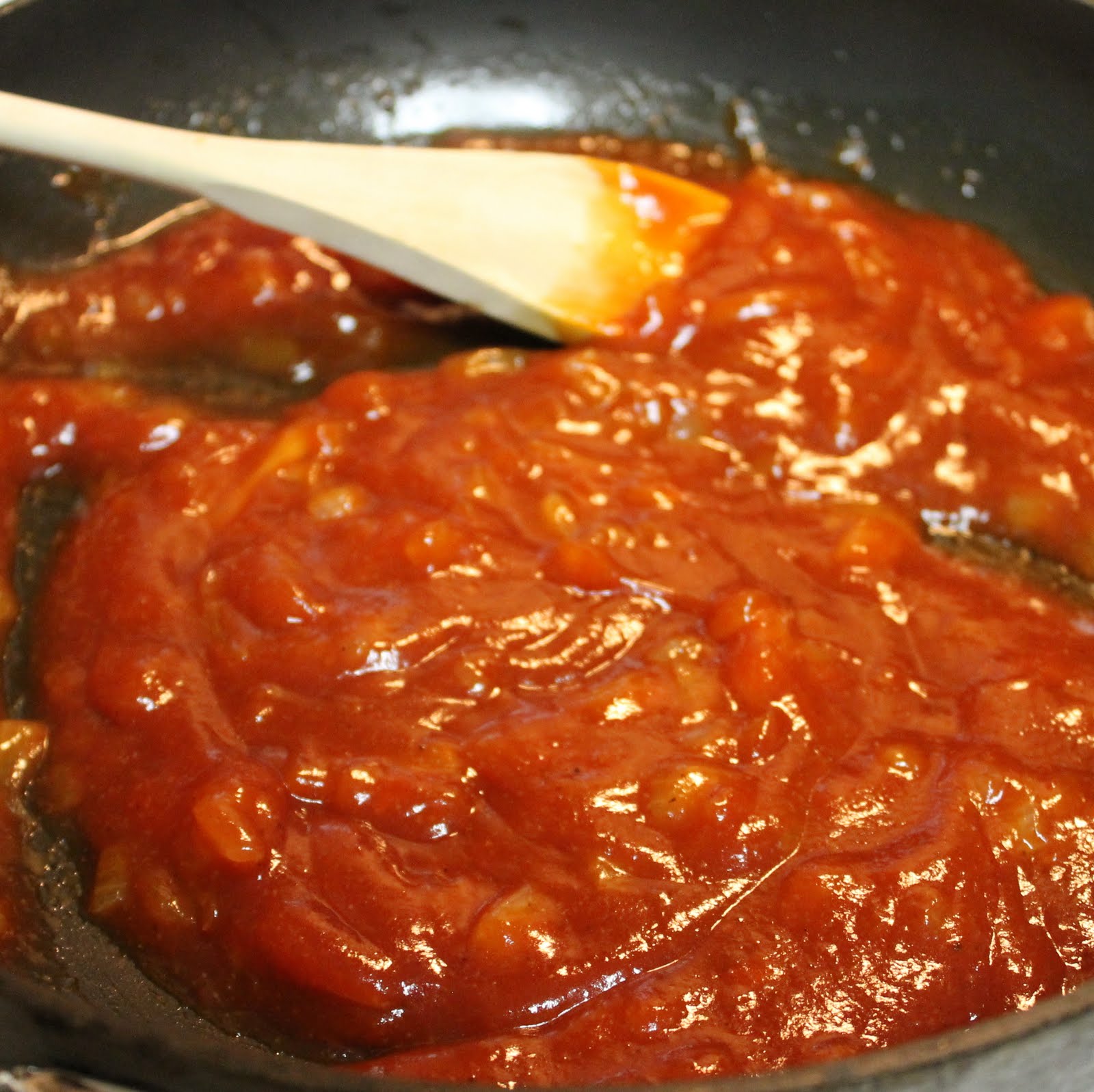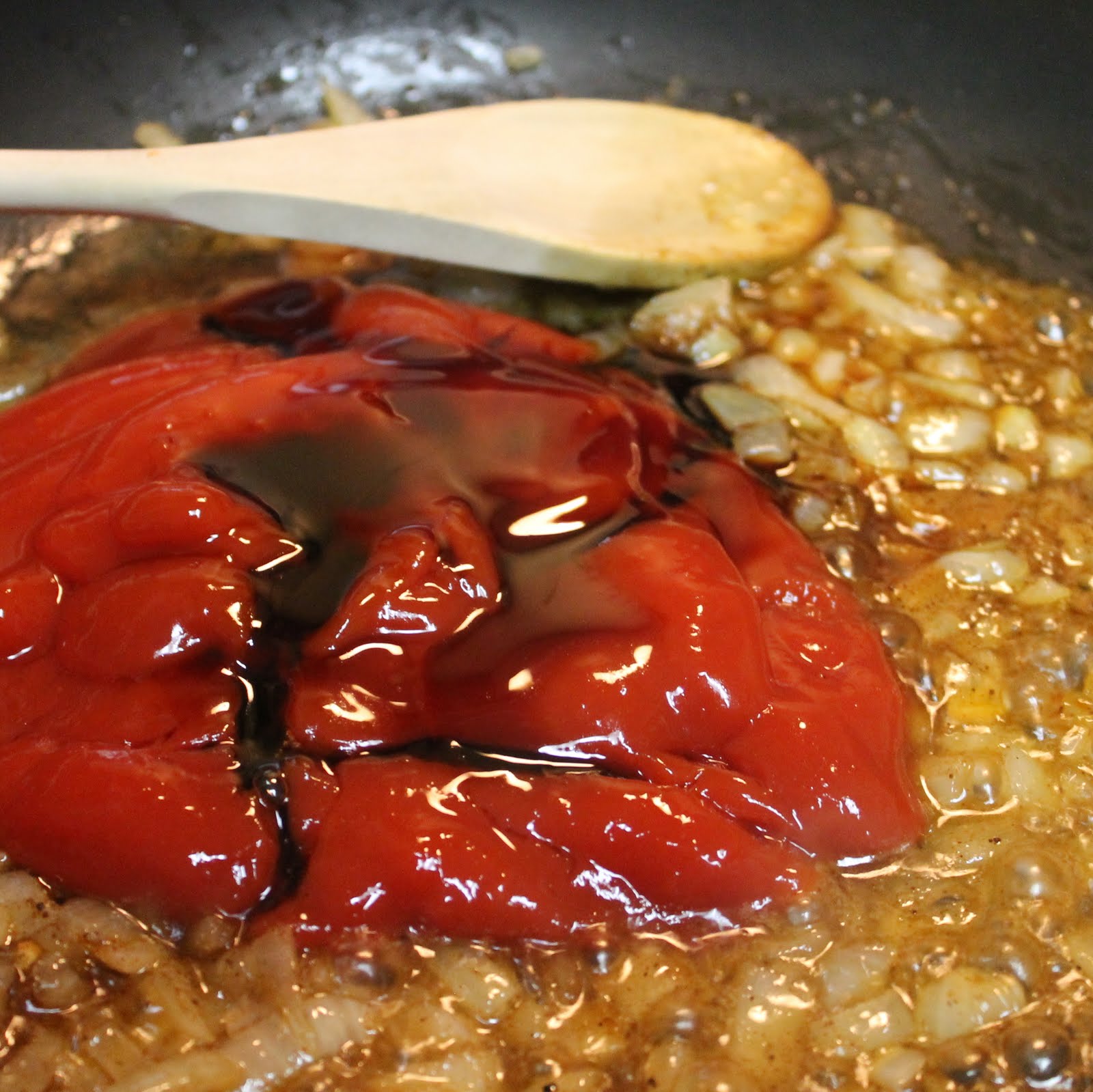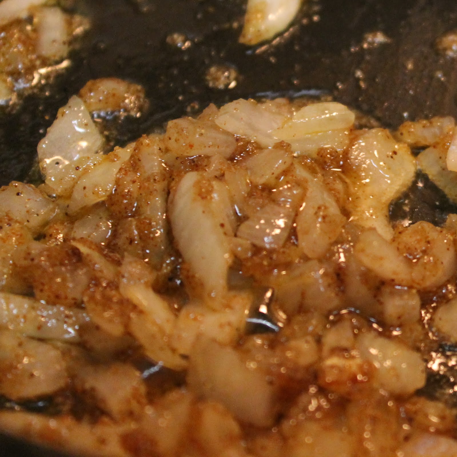 To prepare sauce, heat oil in a medium saute pan over medium heat. Add onion and cook for 5 minutes or until soft. Stir in 2 tablespoons brown sugar, and the next 5 ingredients (chili powder through ground red pepper) and cook for 30 seconds.