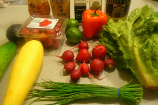 When I usually make salads, I tend to just throw in there whatever I happen to have in my fridge. I received romaine lettuce and radishes as part of my CSA this week, so I thought it was time to explore new salad recipes. I found one on myrecipes.com, originally from the May 2008 Cooking Light magazine. This one caught my eye immediately; look at those colors!