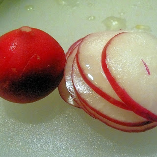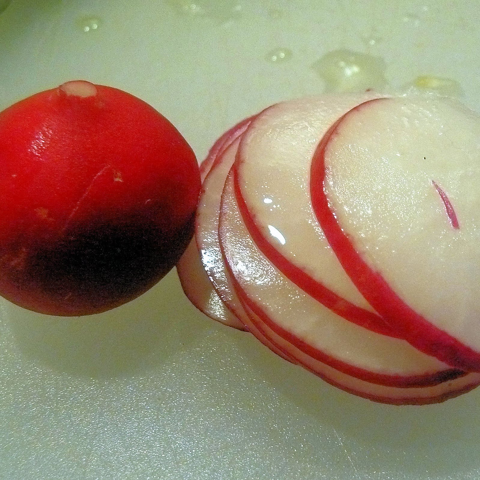 The radishes I had were tiny, and I was afraid to try to thinly slice them without losing a finger. I used a mandolin slicer to slice the radishes as thin as possible. Be very careful not to get your fingers!