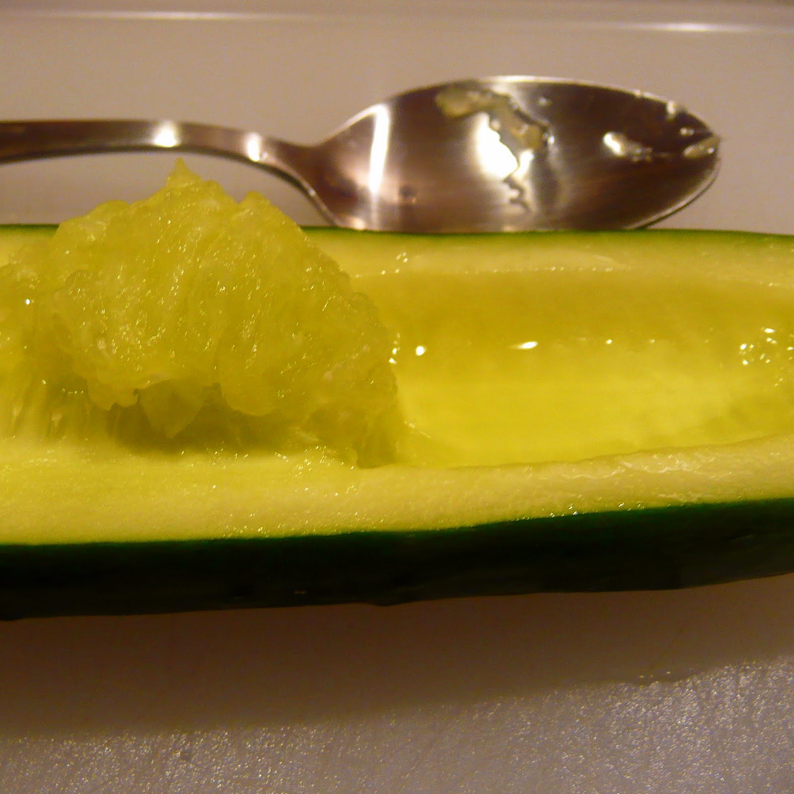 Begin by prepping your vegetables. Cut the cucumber in half lengthwise, and use a spoon to remove all seeds.