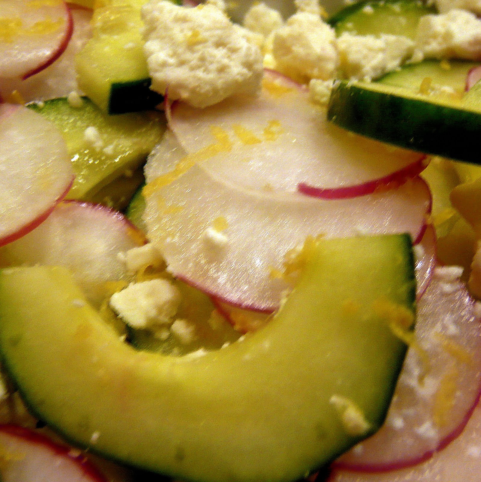 Add the sliced cucumber and radishes to a bowl. Zest the lemon into the same bowl.