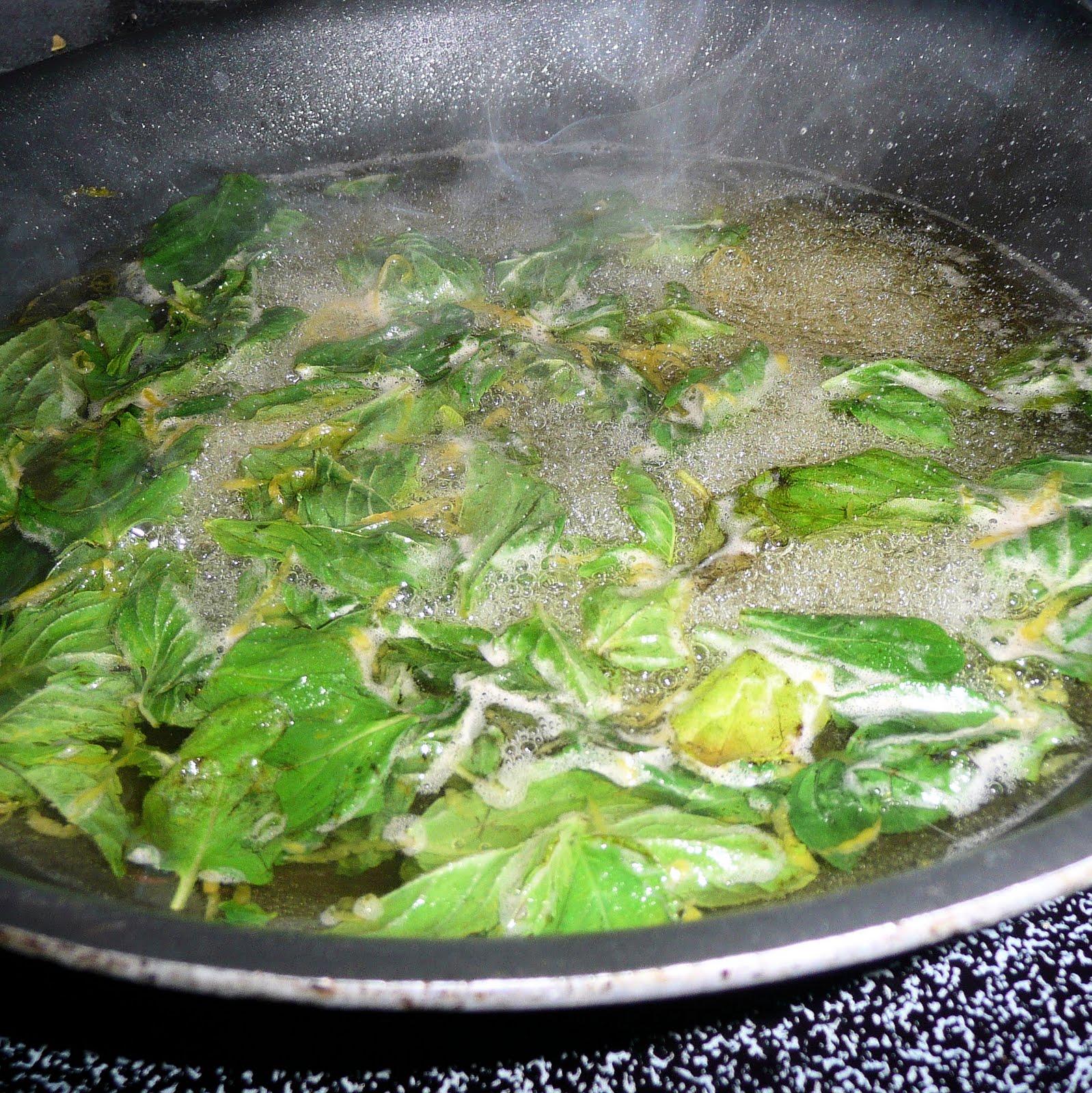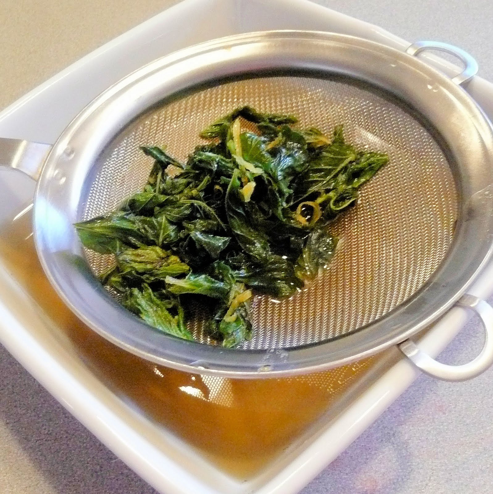 After 20 minutes, remove all leaves and lemon zest from the syrup using a slotted spoon or a strainer.