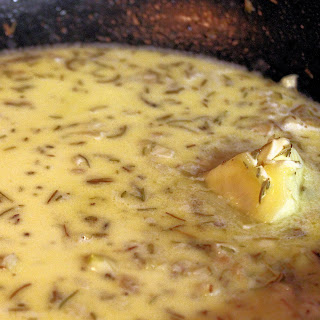 Lower the heat and add the chicken stock, stirring. Add the rest of the butter and the cream and stir to combine.