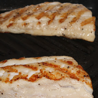 Last but not least, we have the bass. Heat a grill pan over medium high heat and spray with cooking spray. Sprinkle the fish with salt and pepper and add to the grill pan skin side up. Cook for 4 minutes. (You can set your table during this time).