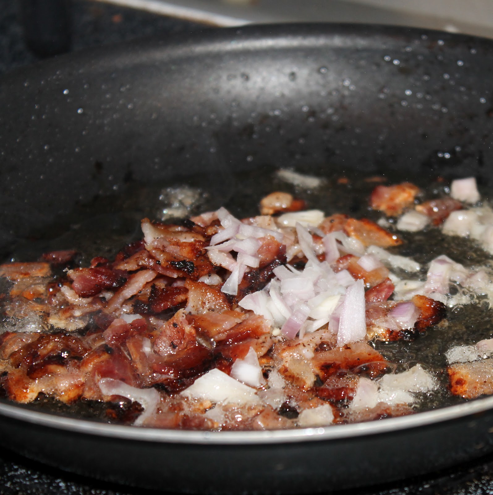 Add the crumbled bacon and 2 tablespoons shallots back to the pan, cooking over medium heat for 1 minute stirring frequently.