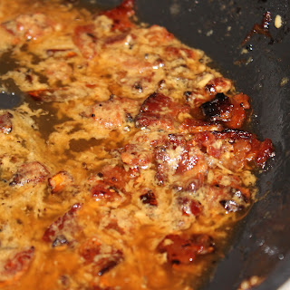 While waiting for the two to cook (and if you have room on your stove), add another saute pan over medium high heat. Add the bacon and cook until crisp. Remove from heat and add to a paper towel. Reserve 1.5 tablespoons of the drippings in the pan. Crumble the bacon.