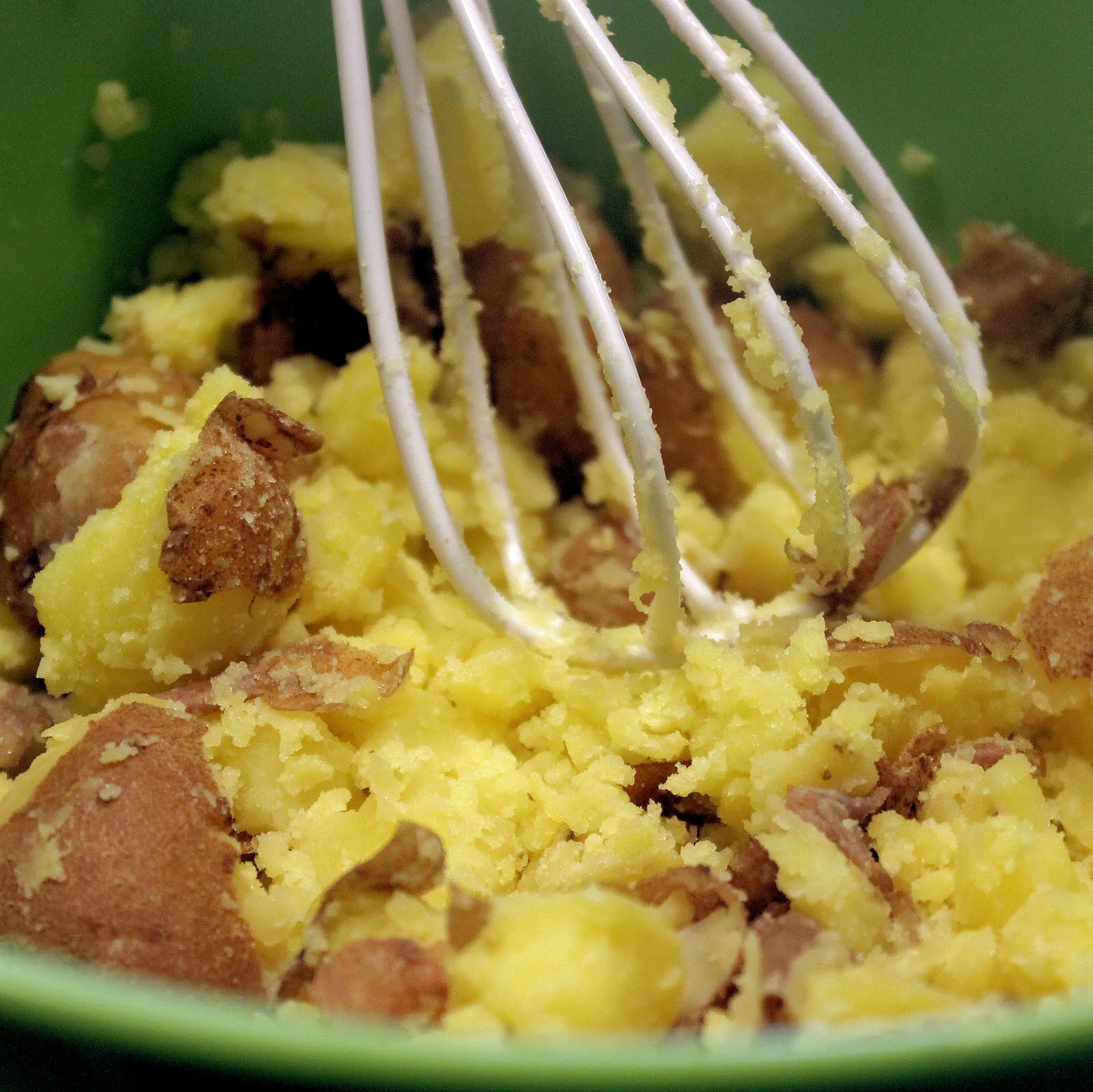 Drain the potatoes and add to a medium sized bowl. using a large spoon or a whisk, smash each of the potatoes. Don’t go overboard, you want them to be chunky.
