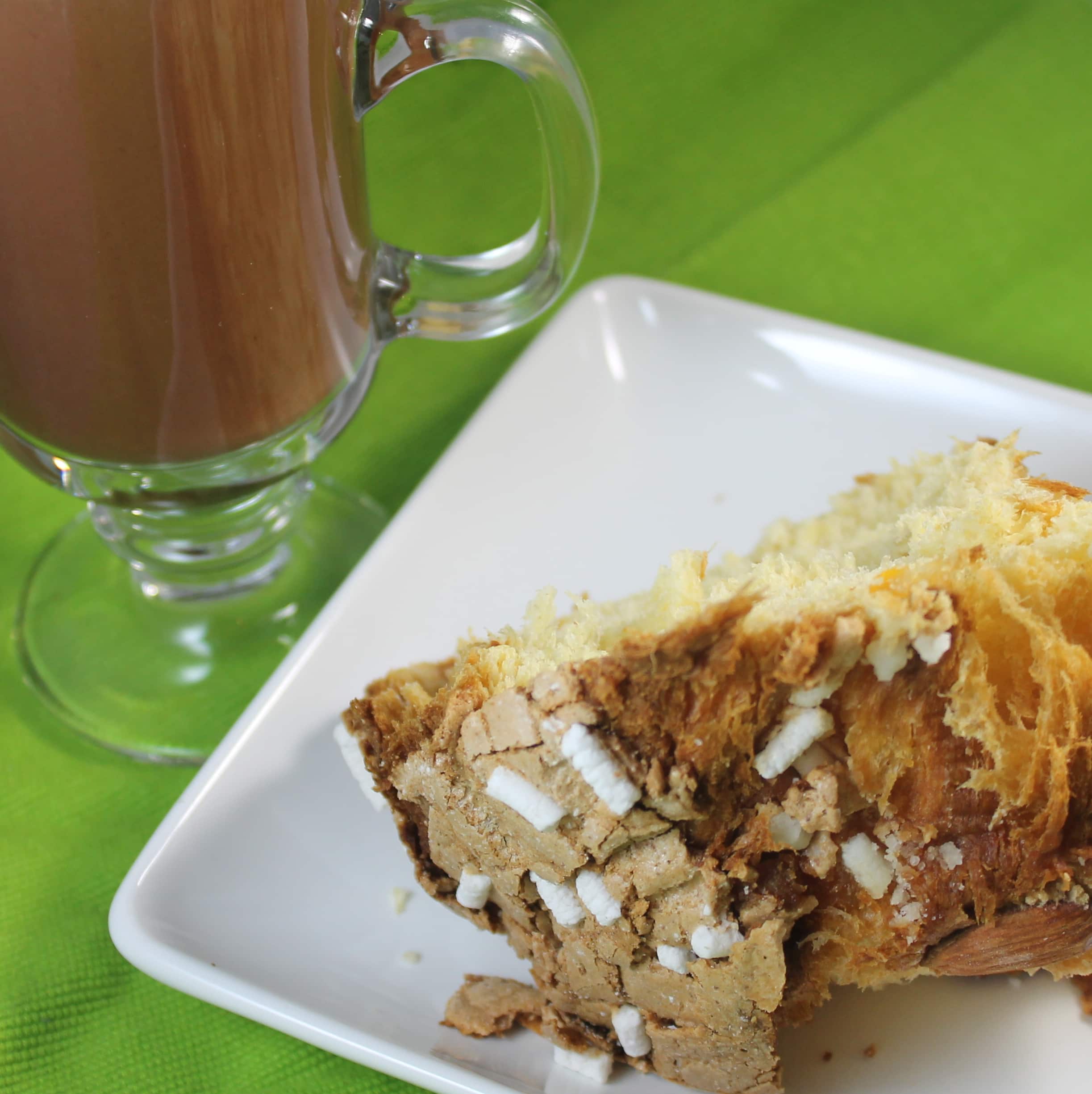 The cake is delicious with a cup of coffee, espresso, or a hot chocolate. I went with hot chocolate and loved the pairing!