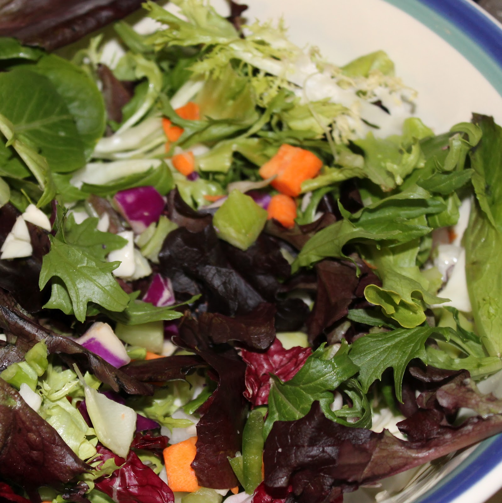 Prepare your lettuce by washing and rinsing the Romaine and red leafy lettuce. Tear with your hands and add to a bowl.