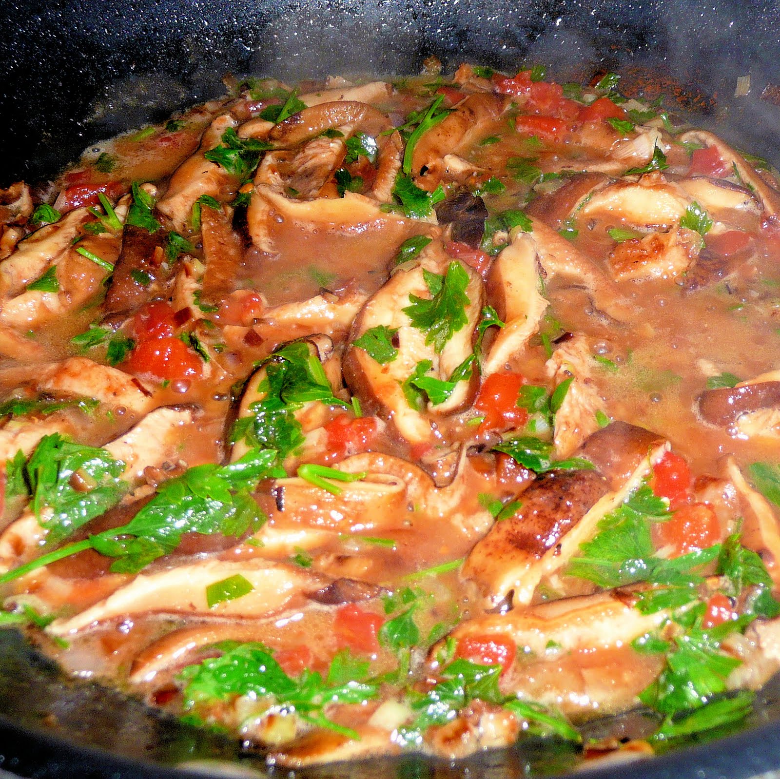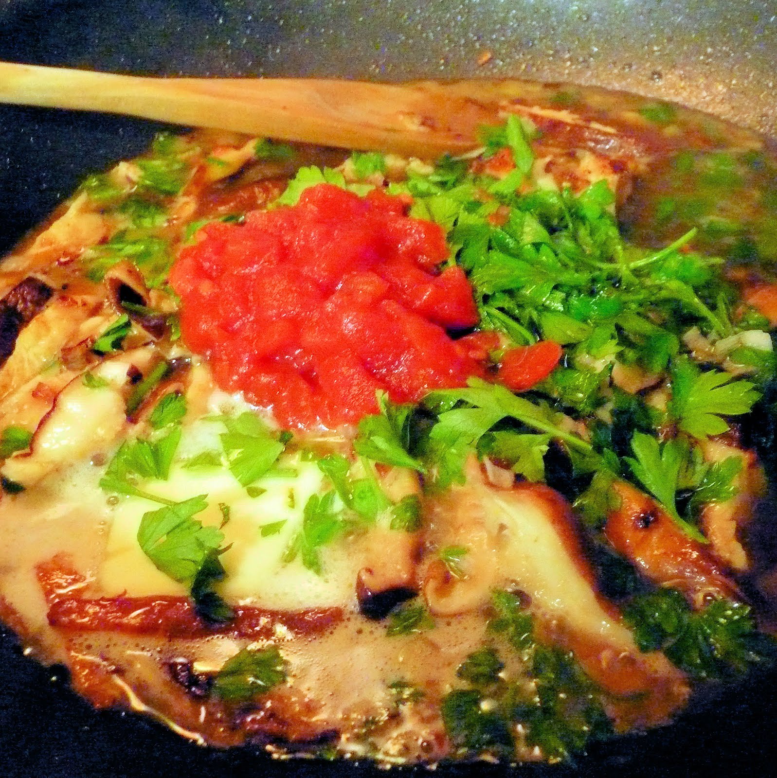 Add remaining 2 tablespoons butter, chicken broth, parsley, tomatoes, white wine, and lemon juice.