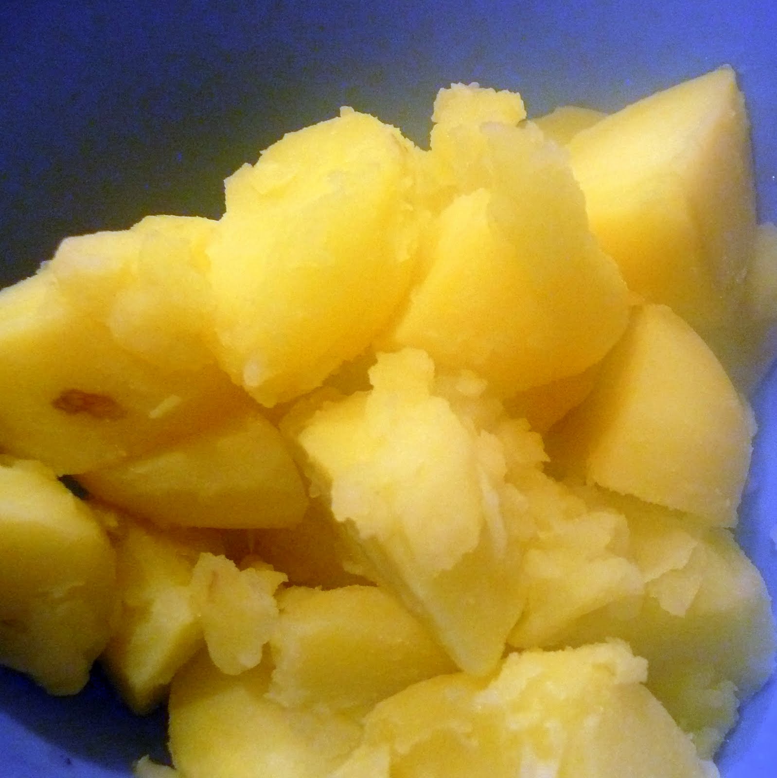 Bring 2 to 3 quarts water to a boil. Peel the potatoes and cut into 1-inch pieces.