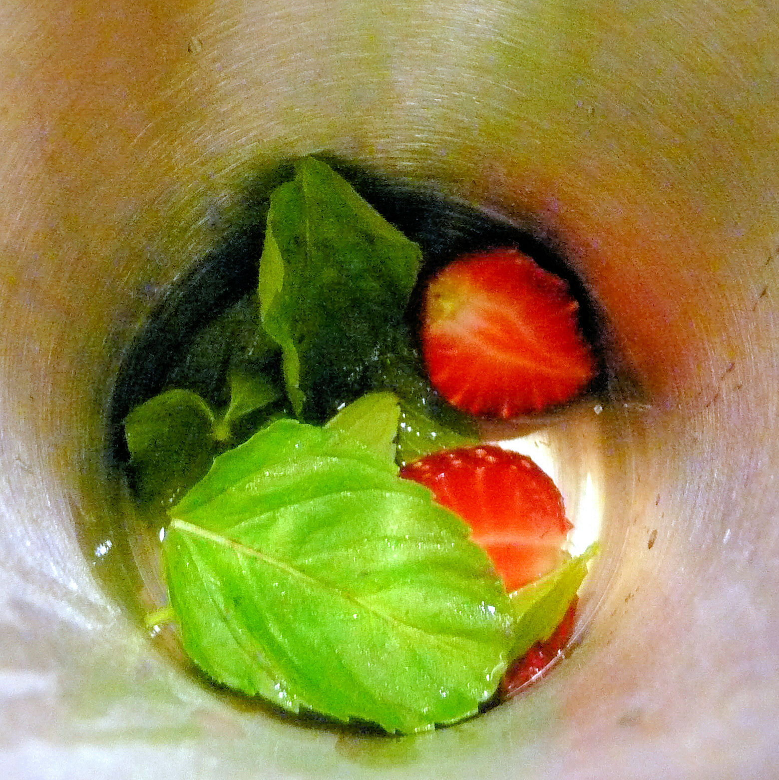 Add the juice from 1/2 a lime, two strawberries (4 halves), 1 teaspoon simple syrup, and the mint leaves to a glass.