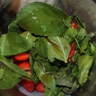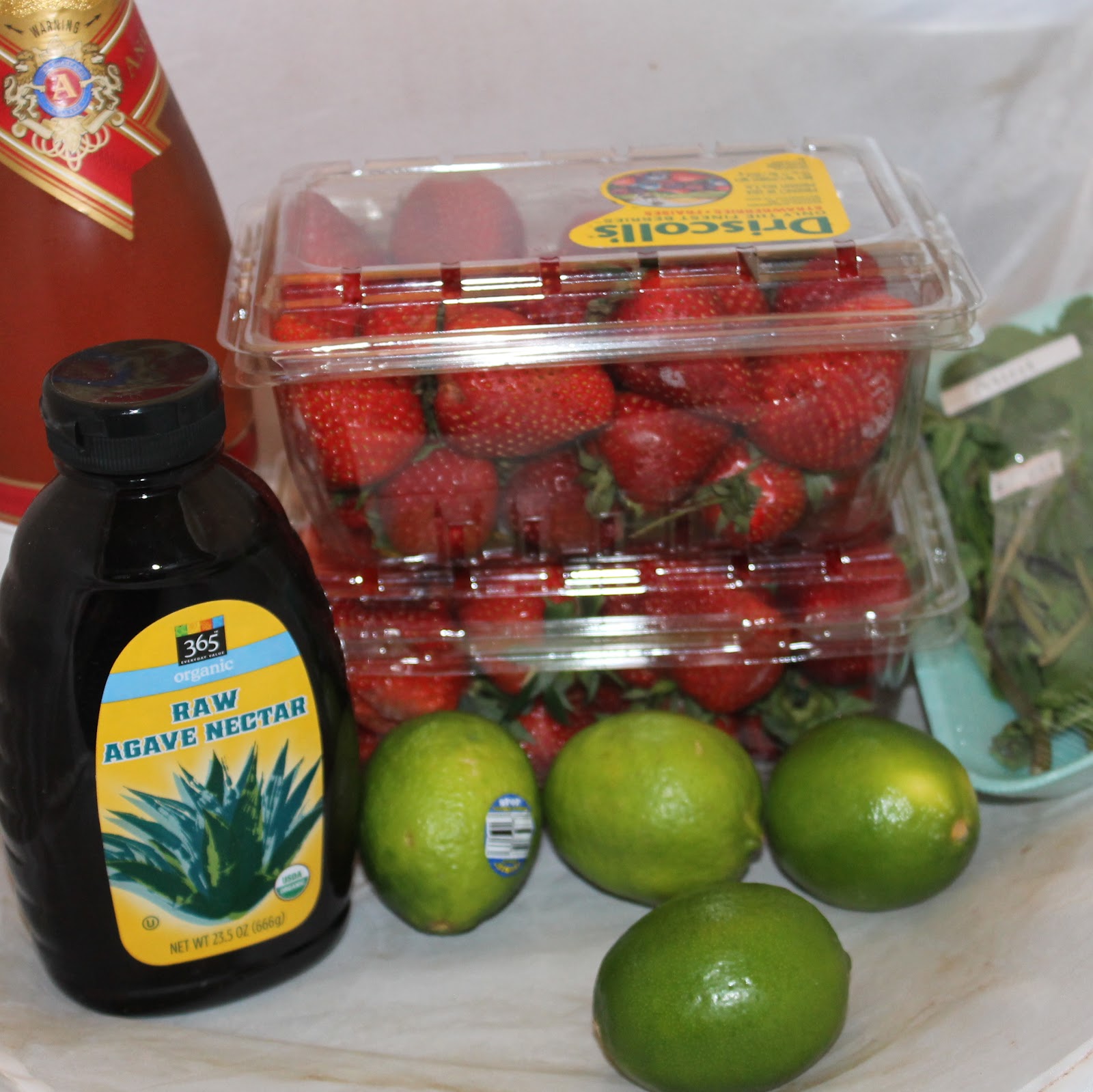 To make, place the strawberries, mint leaves, limes, water, and agave nectar in a blender.