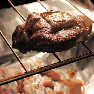 I think my parents worry about my somewhat limited meat intake. It’s not that I don’t like meat, I just tend to grab seafood or cook with the veggies in my CSA share instead. Last time I saw them, they gave me two top sirloin steaks from Omaha steaks, woo hoo! I thought I’d try broiling them, but straight on the rack in the hopes of getting “grill” marks on the steak. I found this method on Food Network’s site, an Alton Brown recipe, and decided to add a little garlic on top to make it my own.