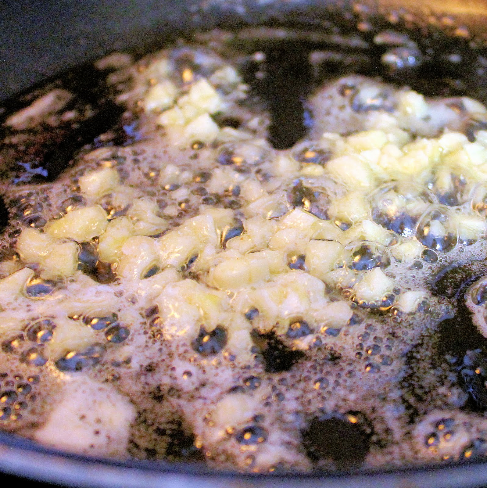 While the steak is cooking, melt the butter over medium heat in a saute pan. Add the garlic.