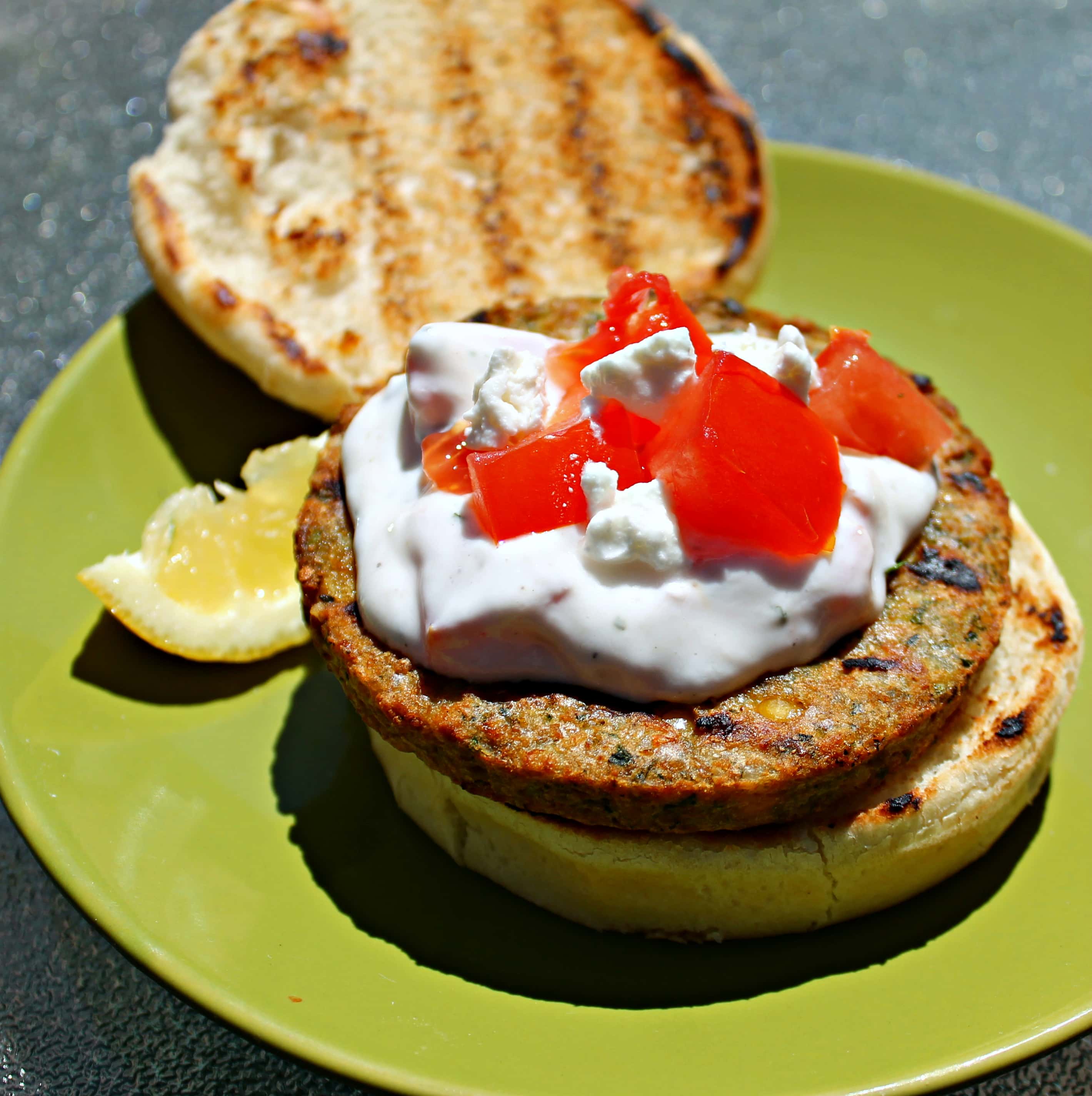 To highlight the Mediterranean flavors in the burger, I decided to make a Tzatziki style topping and finish it off with some feta cheese. Tzatziki is normally made with a strained yogurt, cucumber, lemon, and mint. I decided to make a topping that is in the style of tzatziki but uses tomatoes and dill with a touch of a ranch dressing dry packet to really amp up the flavor.