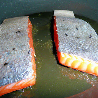Last but not least, we have the bass. Heat a grill pan over medium high heat and spray with cooking spray. Sprinkle the fish with salt and pepper and add to the grill pan skin side up. Cook for 4 minutes. (You can set your table during this time).